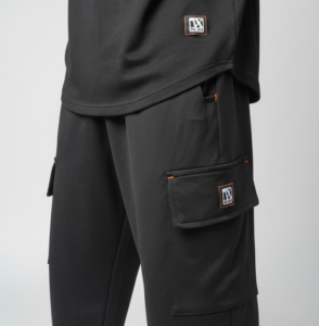 • البنطال: بنطال جوجر بقصة عصرية مزود بجيوب جانبية (Cargo) وشعارات مطرزة بدقة. الخياطة البرتقالية الخفيفة تضفي تبايناً ذكياً يكسر حدة اللون الأسود.
